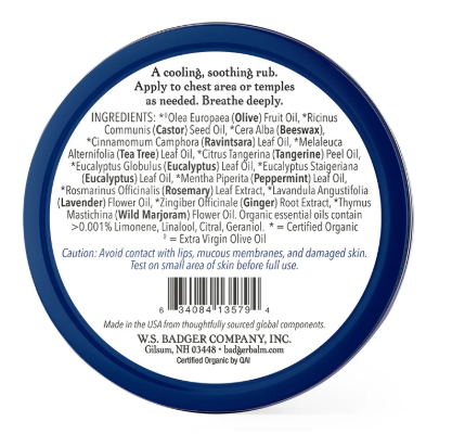 Organic Extra Virgin Olive Oil, Organic Castor Oil, Organic Beeswax, Organic Ravintsara Oil, Organic Tea Tree Oil, Organic Tangerine Oil, Organic Eucalyptus Oil, Organic Peppermint Oil, Organic Rosemary Extract, Organic Lavender Oil, Organic Ginger Extract, Organic Wild Marjoram Oil.