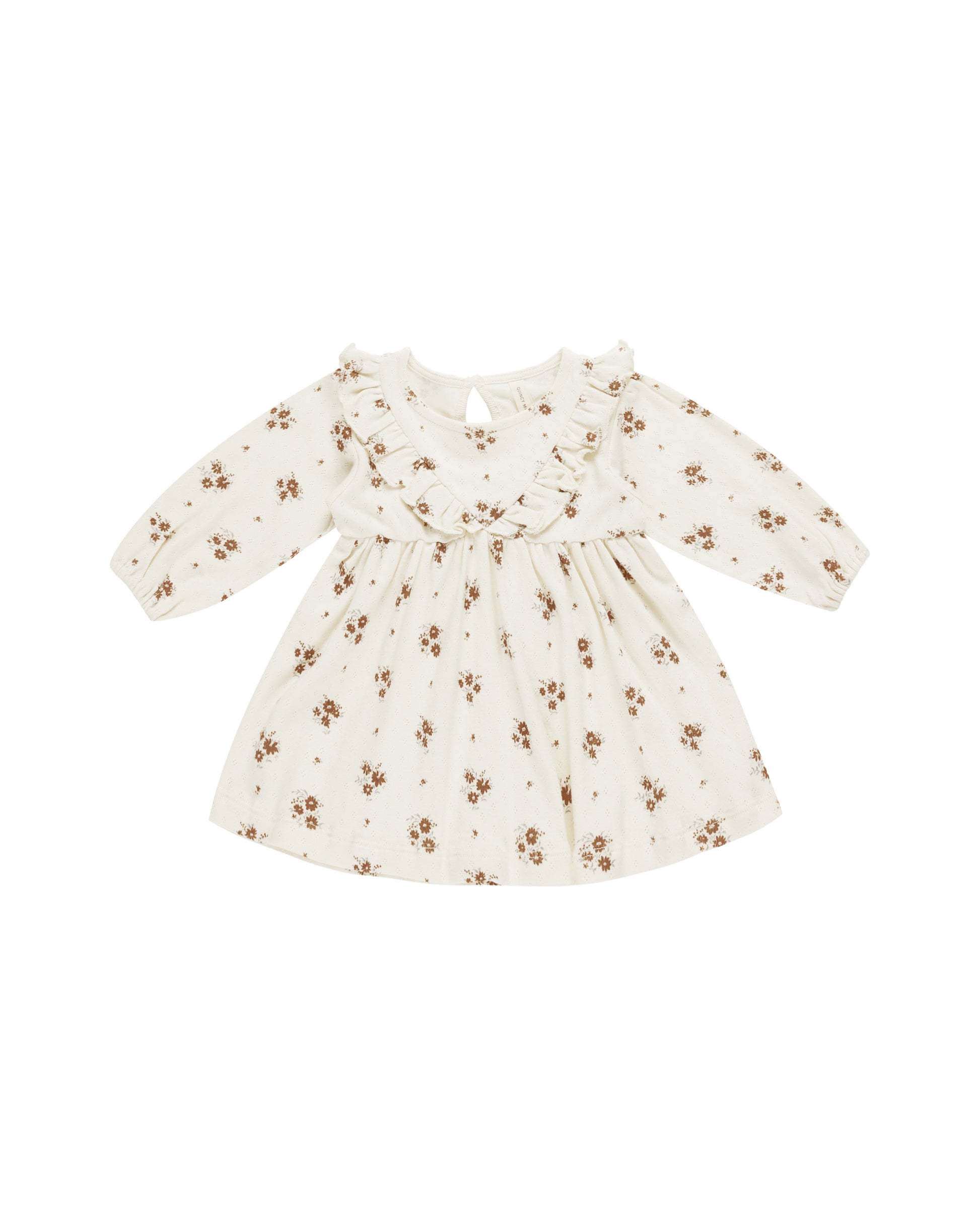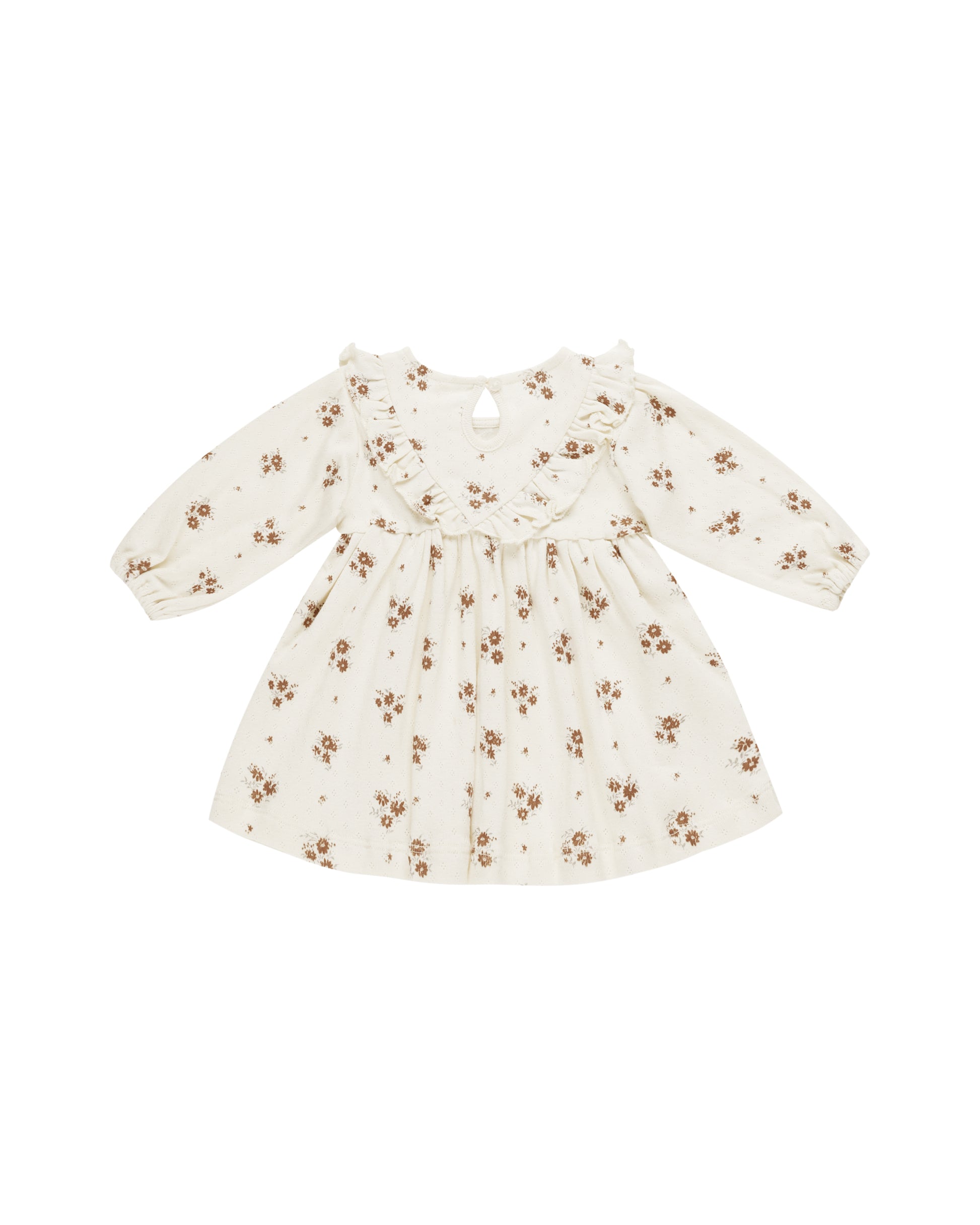 Long sleeve dress with sweet ruffle detail in classic pointelle fabric. Button back closure for easy changing.
