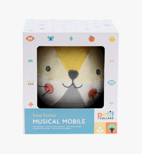 The perfect gift to bring a smile to parents and lull their new baby, this musical mobile is made using organic cotton.