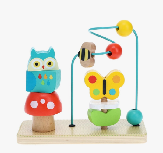 The multi-activity play station features sweet garden-themed pieces. Your little one can spin the flower to meet the butterfly, slide the bee to land on the beads, and stack their new owl friend on a mushroom perch, building dexterity while having fun.