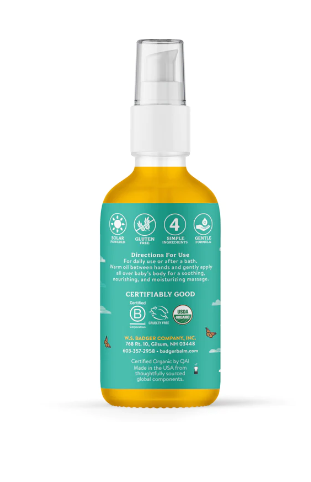 Naturally nourishing and gentle as can be. Soothe and moisturize your baby’s delicate skin with this truly safe, gentle oil. Chamomile and calendula are calming, while extra virgin olive oil and cold-pressed jojoba glide easily over sensitive patches to nourish and soften. Cruelty free, GMO free, and made with just four USDA Certified Organic ingredients.
