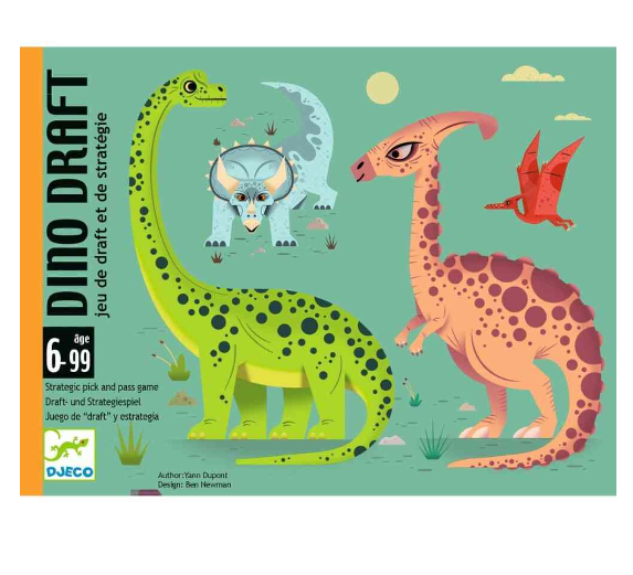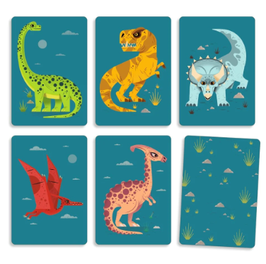 The Djeco game is a card game where you have to think strategically to collect the most points and win the game. First you have to draw a color card and a dino card. This combination is your secret mission. Now you have to take turns laying the cards on the table with either your secret color or dino, or with the card you think are your opponent's secret mission.