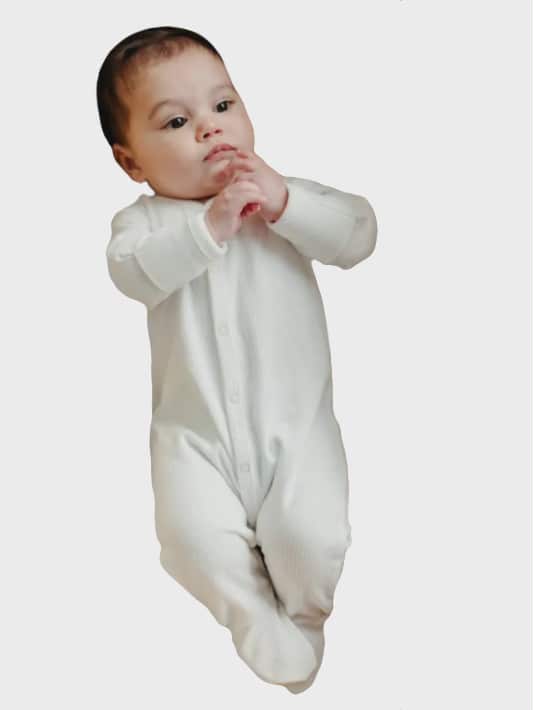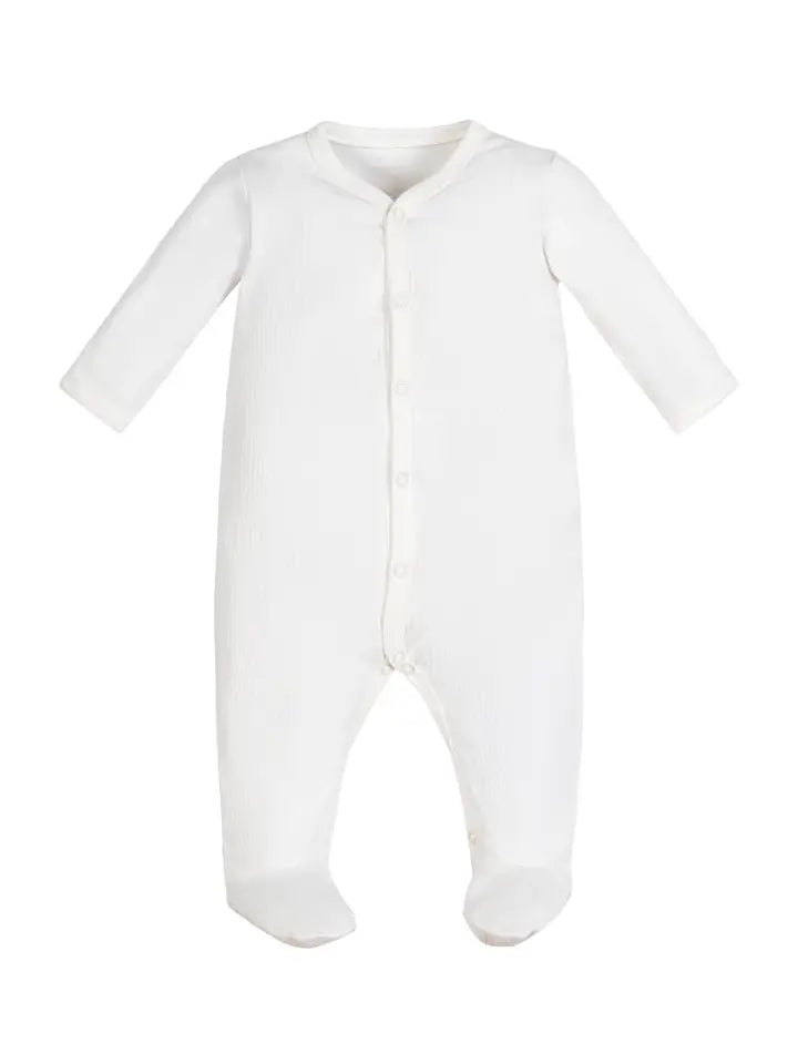 This comfortable drop needle rib knit snap front footie lets a baby crawl freely with a snug and comfy fit and features a classic white that's gender neutral and perfect for any baby layette.