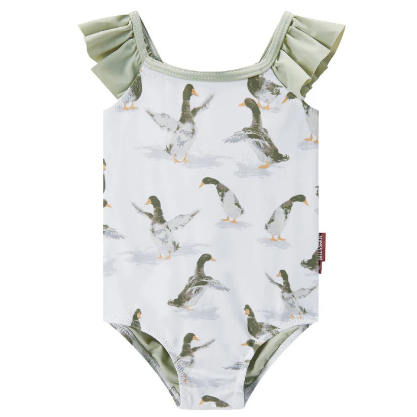 Your little one will look adorable in our Ruffled Cross Back Swimsuit in the Duck print. Featuring delicate ruffle accents and a stylish cross back design, this swimsuit is sure to make a statement.