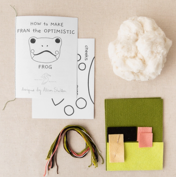 This kit includes: wool felt cotton stuffing sewing needle thread pattern pieces instruction booklet