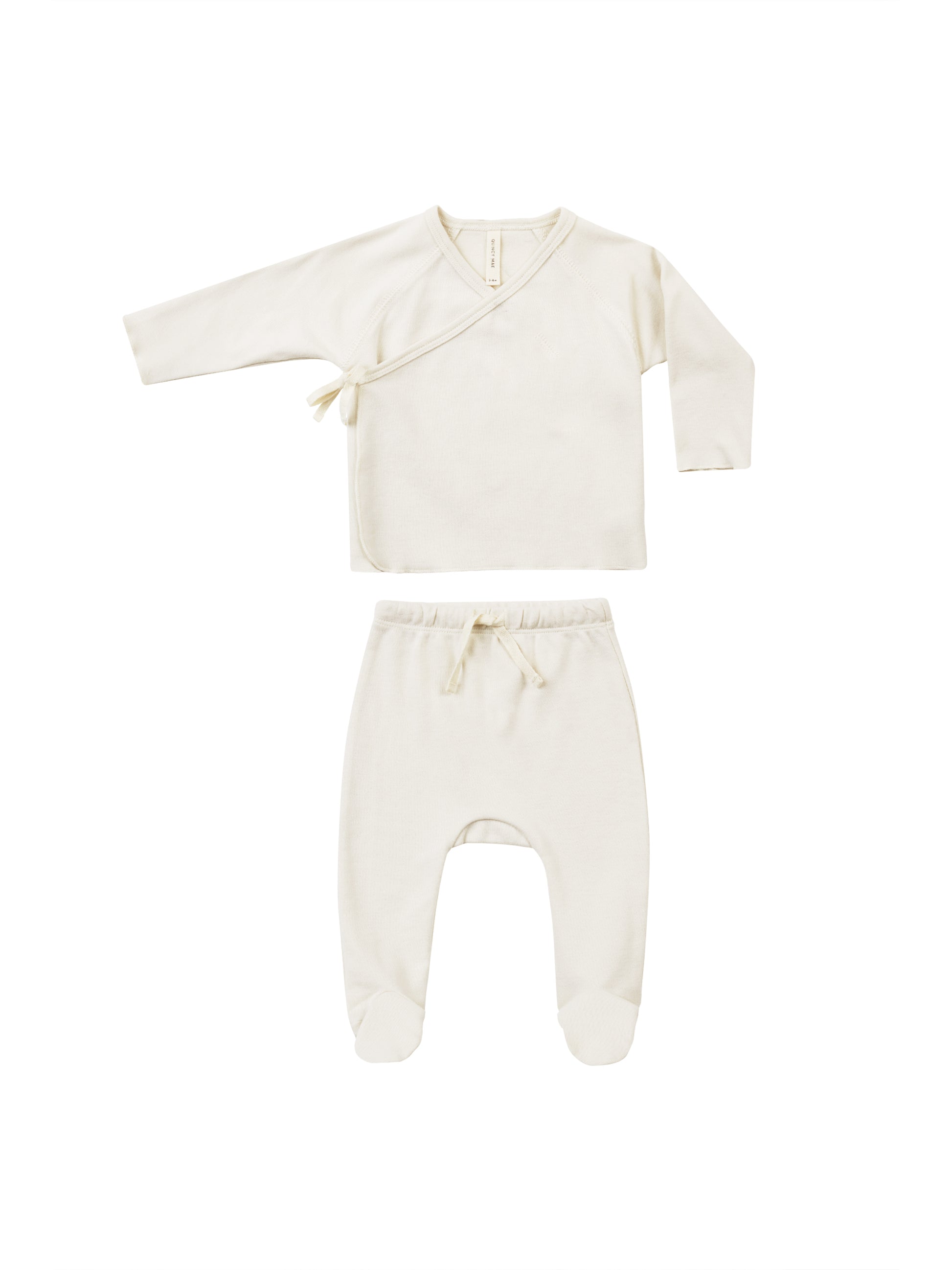 Long Sleeve wrap top + footed pant set is made out of organic brushed jersey that ties on the outside for a comfortable fit, with matching footed drawstring pants.