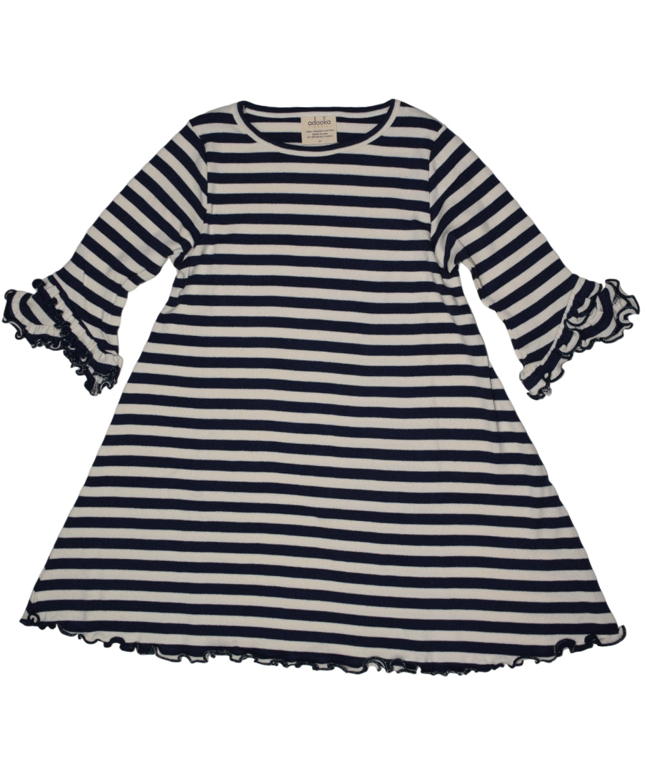 Made of the softest interlock cotton each Joyful Dress features a 3/4 sleeve with ruffle detailing and ruffle hem. Pair with Natural or Striped Ruffle Leggings.