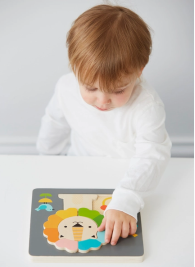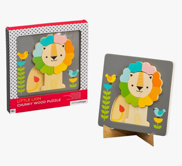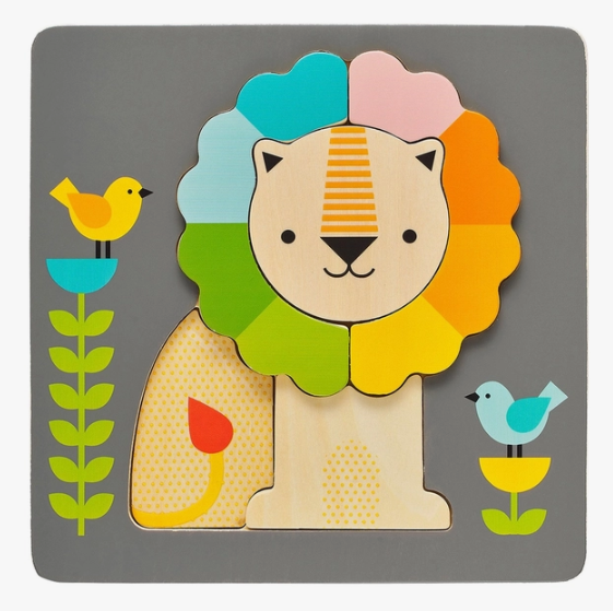 Little ones can easily grab onto the five chunky wooden pieces to create their little lion friend in his colorful scene. 5-piece multi-layered wooden lion tray puzzle
