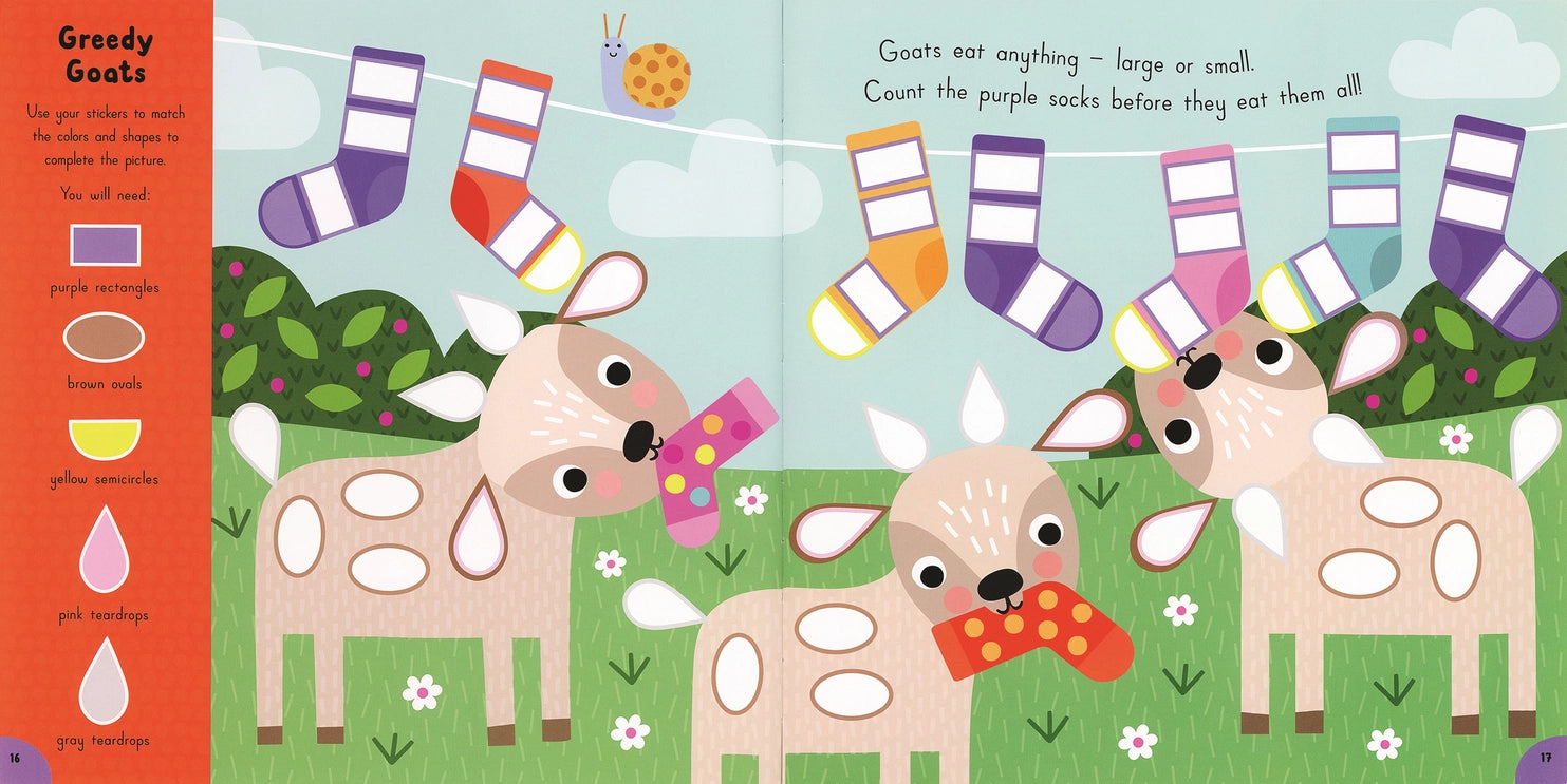 These early learning activity books, with over 500 reusable sticker shapes to match to the pictures, are designed to increase color and shape recognition, as well as support fine motor skills development. Finish the scenes of happy hens, greedy goats, buzzy bees, and more with the reusable sticker shapes for farmyard fun!