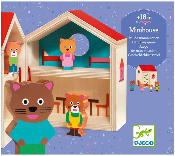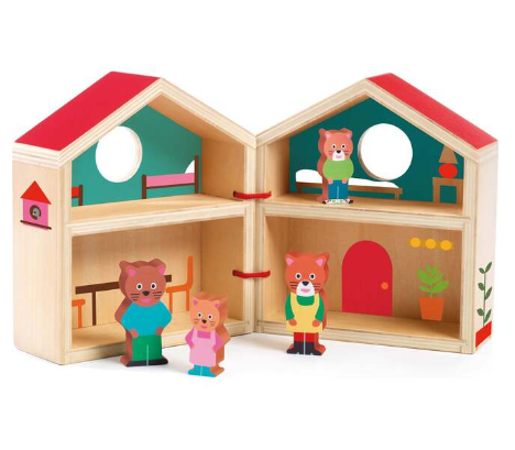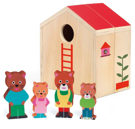 A wooden house for very young children (18 months and up) to play with. When they open the house, children can see the beautifully decorated inside where the family of cats (mother, father and 2 children) live. They can play with the wooden cats and have fun making up stories. When they are finished playing, the cats can be stored inside the closed house.