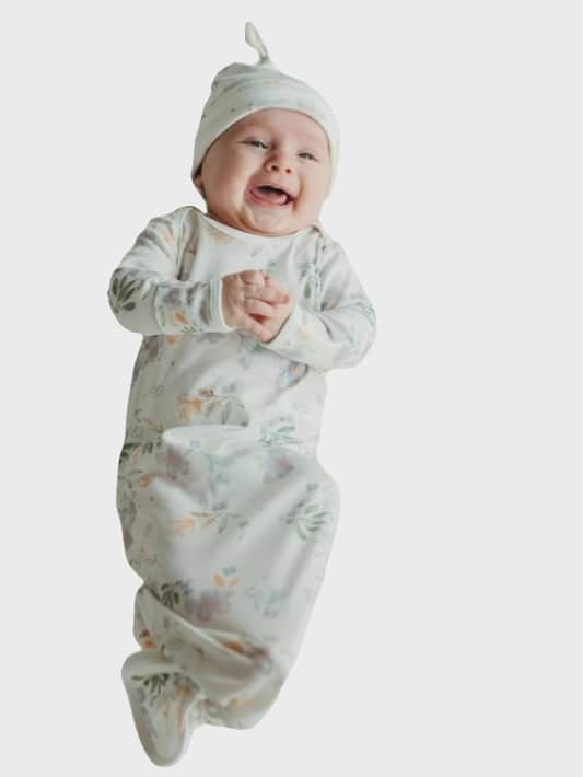 A classic Knotted Gown in a two piece set with the matching Baby Knot hat. This knotted gown allows for easy diaper changes at night with an open tie at the bottom. Made of 100% organic Egyptian cotton, this layette set is perfect for bringing baby home. Keep your little one cozy and comfortable with the gown and beanie, while also supporting sustainable and environmentally-friendly practices. * Fold-over hand mitts sewn into sleeve to keep newborn babies protected from scratches.