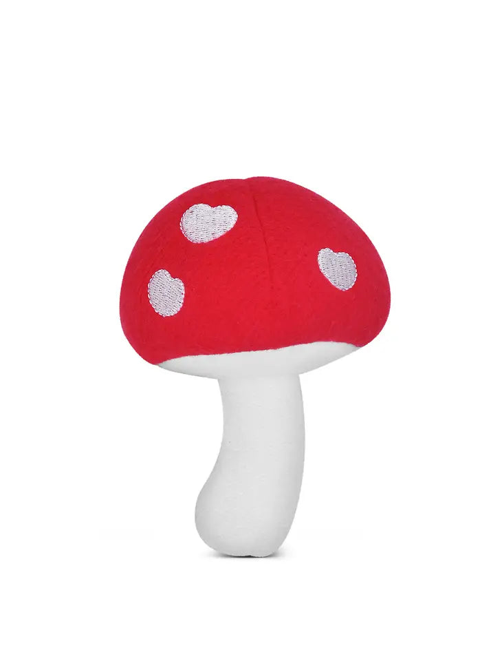 Forage no further - This plump and plush mushroom is made with organic cotton sherpa with tactile embroidered hearts and a delightful rattle hidden inside the cap. These soft mushrooms are the perfect pick for a little hand and they make a soft percussive sound "shi-ta-ki shi-tak-ki-shi-taki."