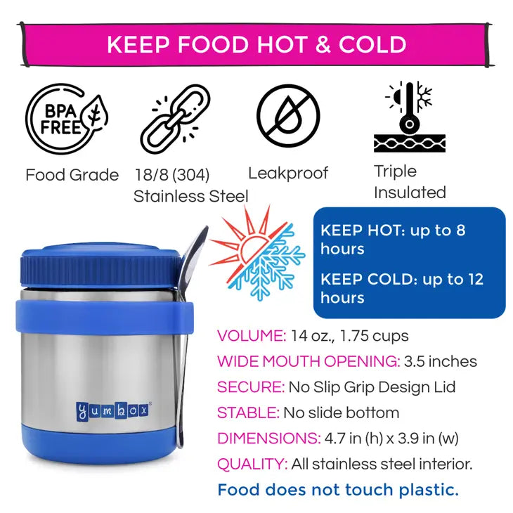 Keeps food warm 6-8 hours Keeps food cold up to 8 hours, use ice pack. Removable silicone band makes carrying a utensil easy. Pack your favorite Foods: soups, pasta, stews, leftovers, yogurt parfaits, fruit salad, cereals in this wide mouth thermos. Pair with Yumbox Snack, Yumbox Original or Yumbox Panino and pack cold foods like cheese, crackers, sandwiches and fruits separately.