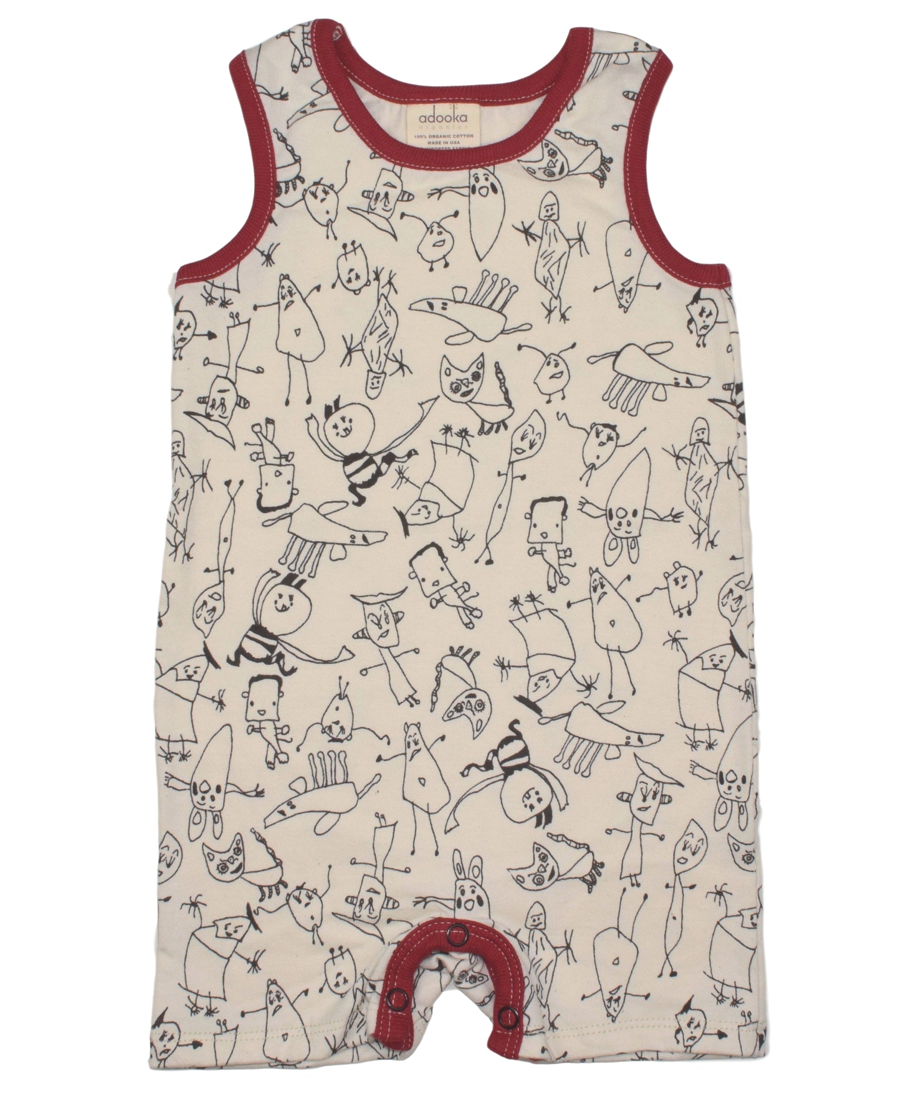 Made of the softest cotton. Tank style romper with all over people print. Natural with red trim.
