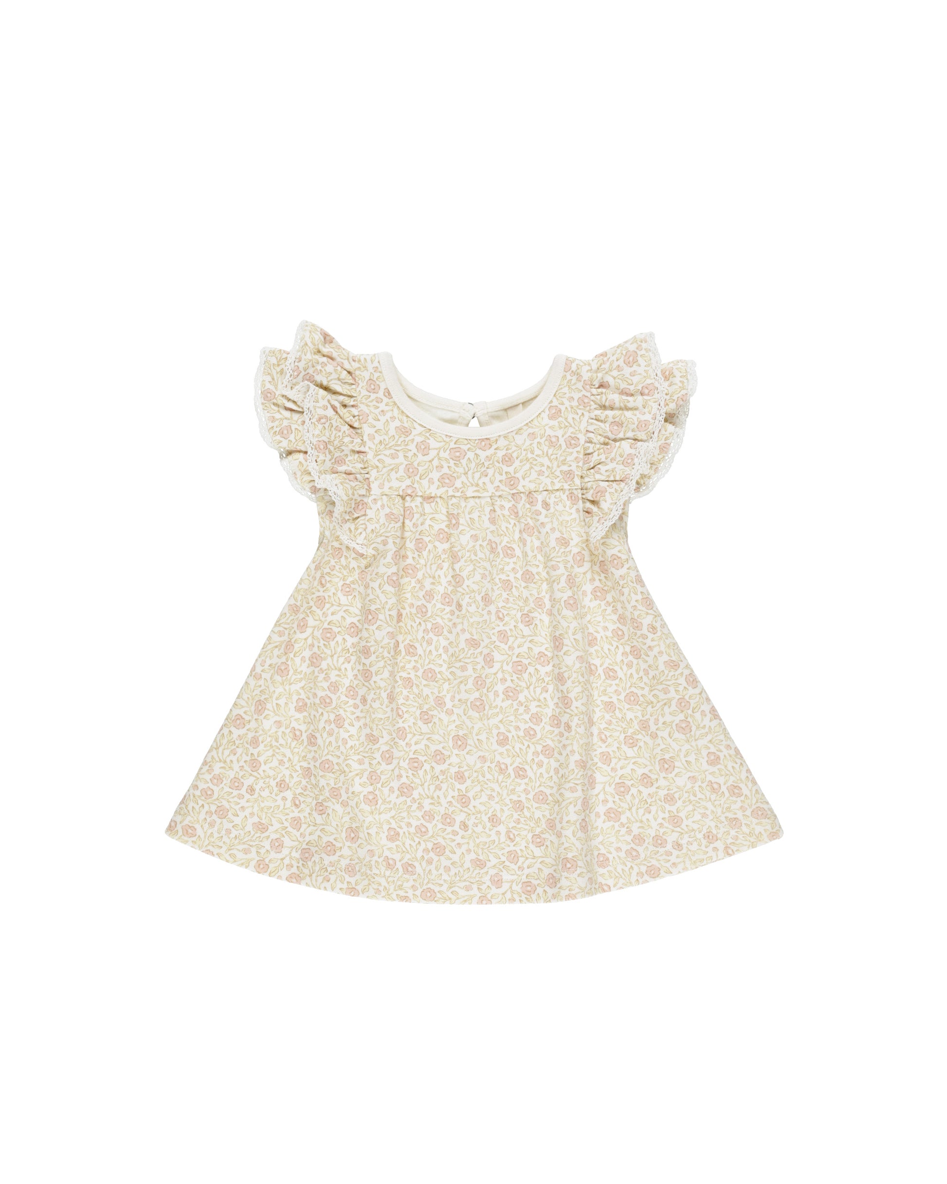 Velvety soft flutter sleeve dress with back button closure. Coordinating bloomers included with all sizes.