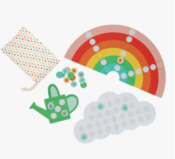 Includes 1 rainbow game board, 1 watering can gameboard, 1 cloud gameboard, 29 pieces in drawstring pouch Perfect for 2 to 4 players Average 15 minutes play time Suitable for ages 4-8 Made using 50% recycled materials Printed on FSC paper with vegetable inks