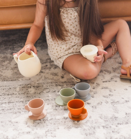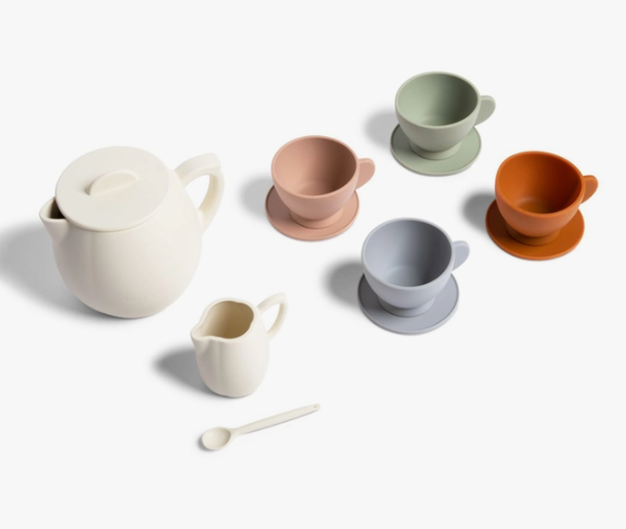 12-piece set includes: Tea pot with lid, 4 tea cups and saucers, one milk jar, and a spoon.