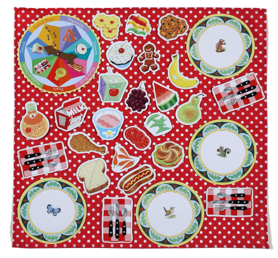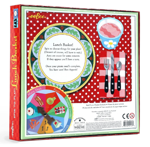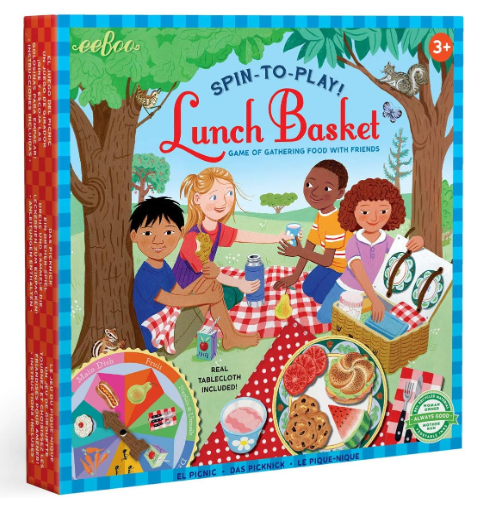 eeBoo’s Lunch Basket Spin-to-Play game helps young children practice patience and social skills. Spin to choose sandwiches, fruit, vegetables, and other colorful picnic food and drinks to fill your plate. Once you have completed your plate with the food categories, you are the winner. All food pieces, plates and spinner are made of sturdy cardboard material and printed with vegetable inks. A colorful 20” x 20” picnic tablecloth is also included.