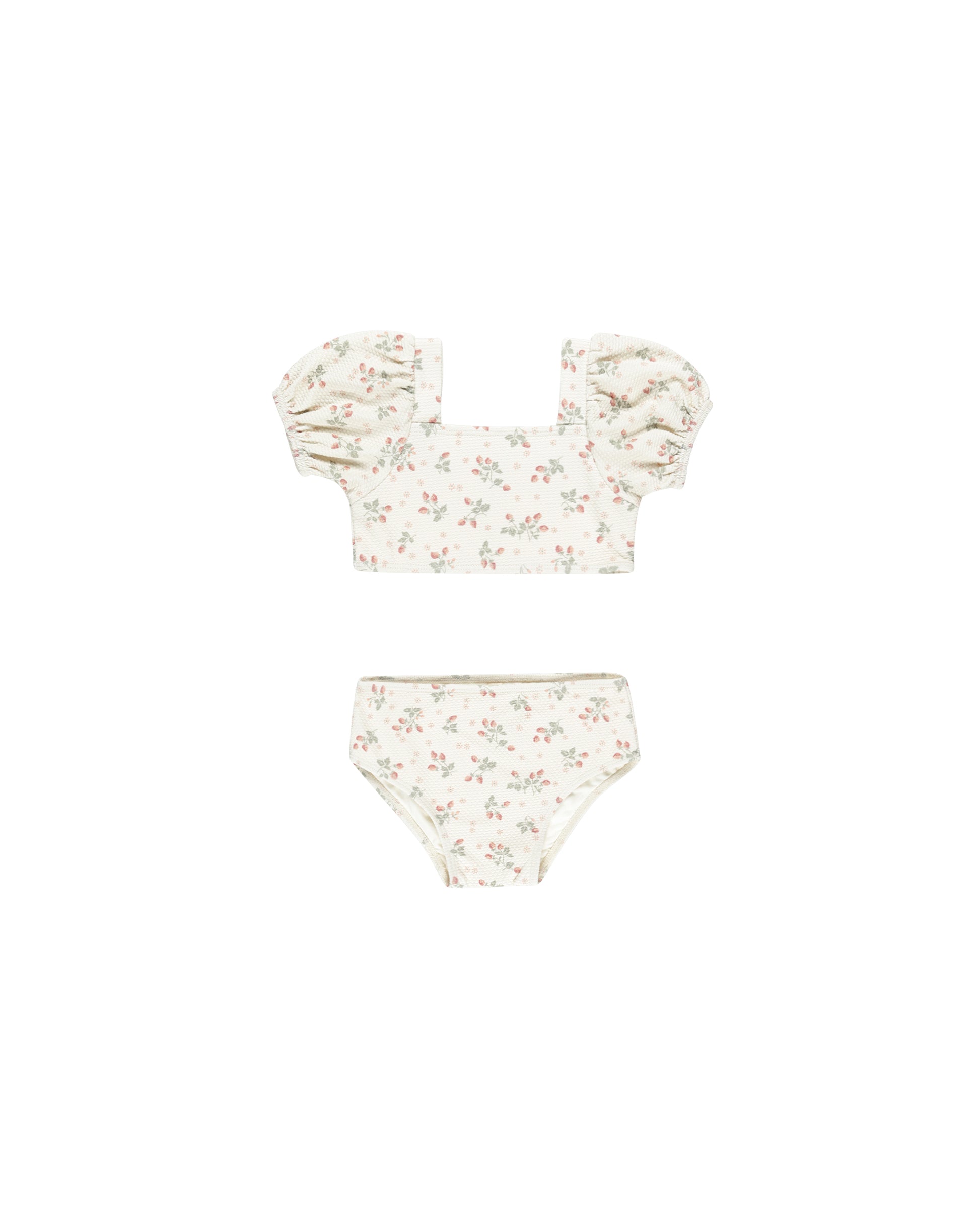 Two-piece bathing suit featuring puff sleeves and a square neck.