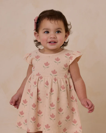 Flutter Sleeve Dress in organic waffle fabric features a full skirt, and flutter details on the sleeves. Perfect for twirling. All sizes include coordinating bloomers.
