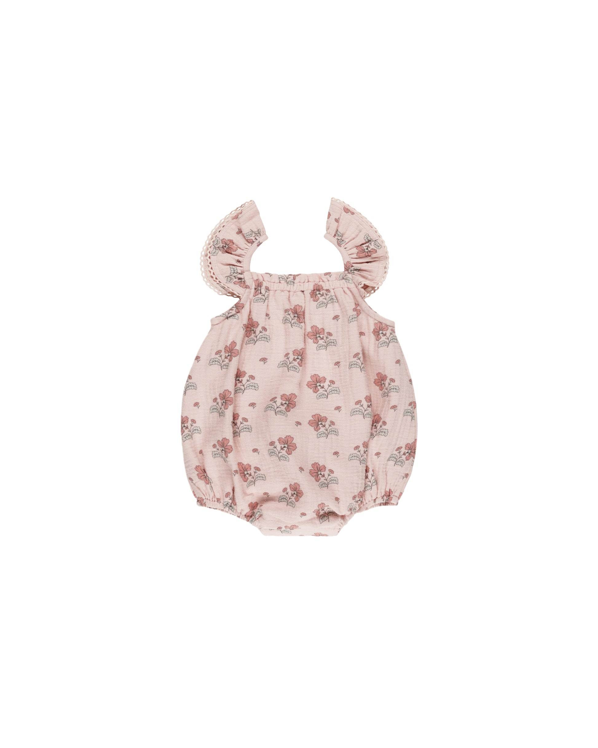 The Bonnie romper features ruffle detail shoulder straps, elastic back neckline, elastic leg openings, and bottom snap closure to ensure easy changing.