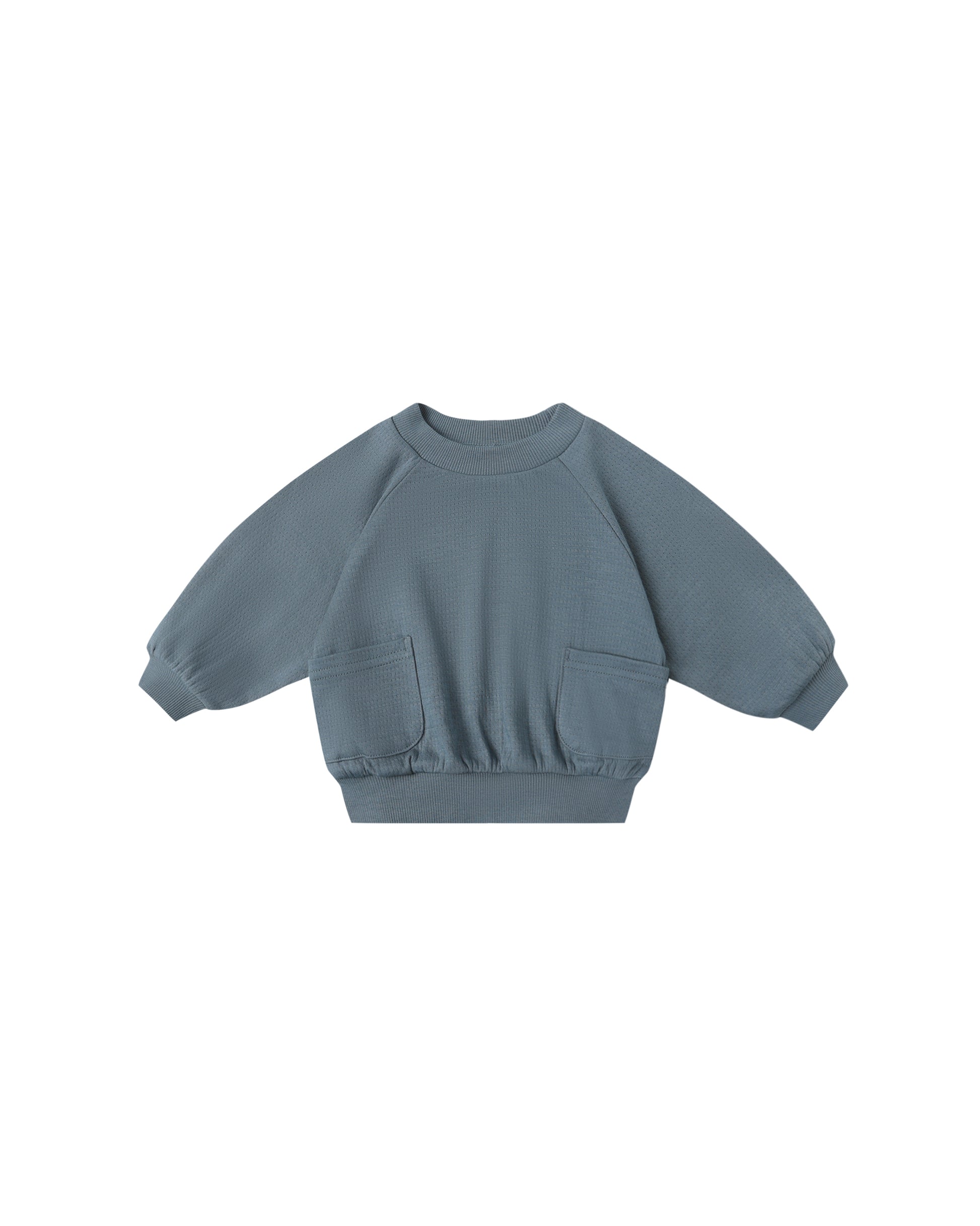 This pocket sweatshirt and sweatpant set is made from soft pointelle fabric. Sweatshirt features gathered sleeves, and patch pockets. Sweatpants have elastic waistband and drawstring closure.