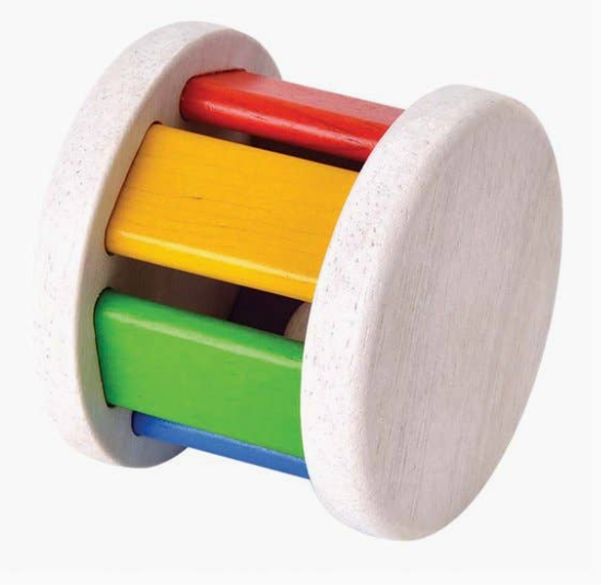 This colorful toy creates a sound when rolled. Stimulates sight and sound.