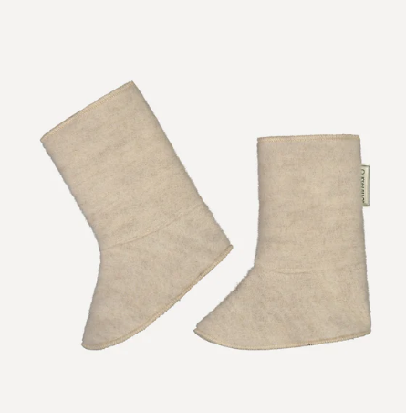 There are two ways to use the soft down pads: first, when smaller, the seam is inside, and as the foot grows, the seams are turned to the outside. The soft brushed wool knit feels pleasant even against bare skin. With the help of the padding, you also extend the life of our wool fleece coveralls after the turns of the legs no longer reach over the toes.