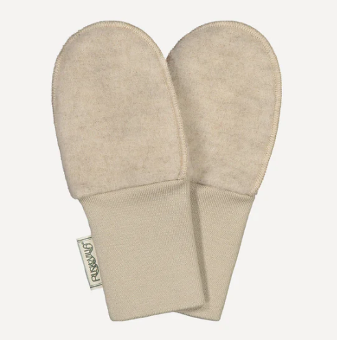These cute baby mittens have no thumb for easy dressing. Ribbed organic cotton cuffs hold the mittens in place. The wool knit is brushed wonderfully soft on both sides, feeling comfortable even against bare skin. The mittens match perfectly with the wool fleece overalls, and will extend its use after the fold-over sleeves no longer extend over the baby's fingers.